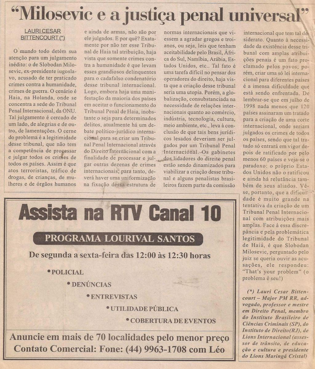 | 43 - MILOSEVIC E JUSTIĂA PENAL UNIVERSAL.(clique aqui para ver a matéria) |
