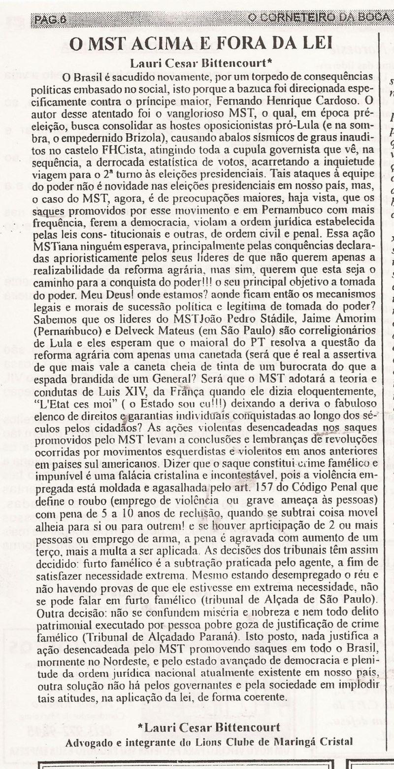 | 108 - O MST ACIMA E FORA DA LEI (clique aqui para ver a matéria) |